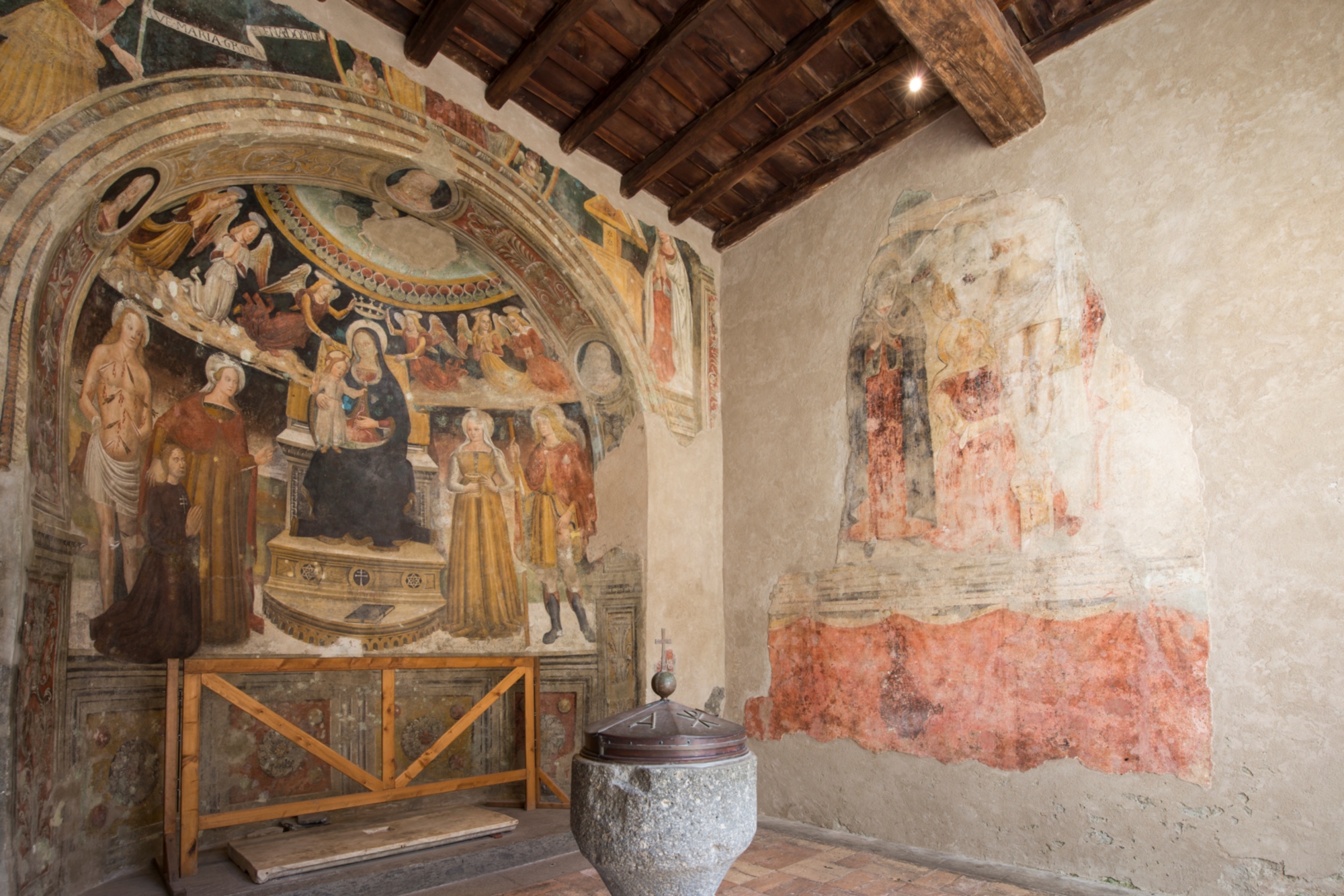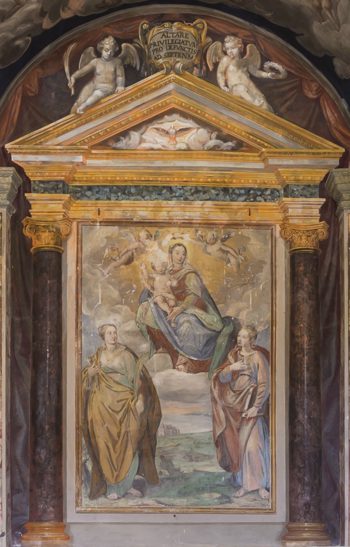 Gli affreschi sono stati senz’altro commissionati dal precettore del Santo Spirito, che può essere identificato con Gabriele De Salis. L’affresco dell’abside vede protagonista proprio Gabriele de Salis, raffigurato in ginocchio di fronte alla Madonna in trono con il bambino. Alla sinistra del precettore sono visibili san Sebastiano e santa Severa. A destra Santa Lucia è affiancata da san Rocco che indica il bubbone della peste sulla gamba.