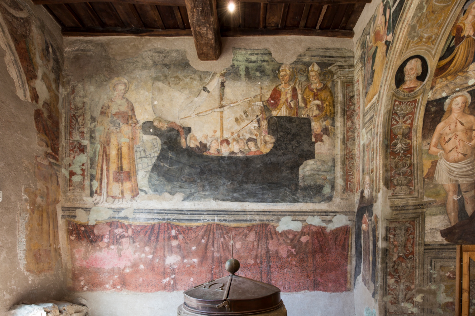 Sulla parete sinistra è rappresentata un’imponente imbarcazione che batte bandiera del Santo Spirito con alcuni passeggeri e all’esterno figure di santi. Si tratta probabilmente di una scena votiva: è verosimile che De Salis volesse sciogliere un voto fatto durante un pericoloso viaggio in mare quando l’equipaggio fu colpito dalla peste.