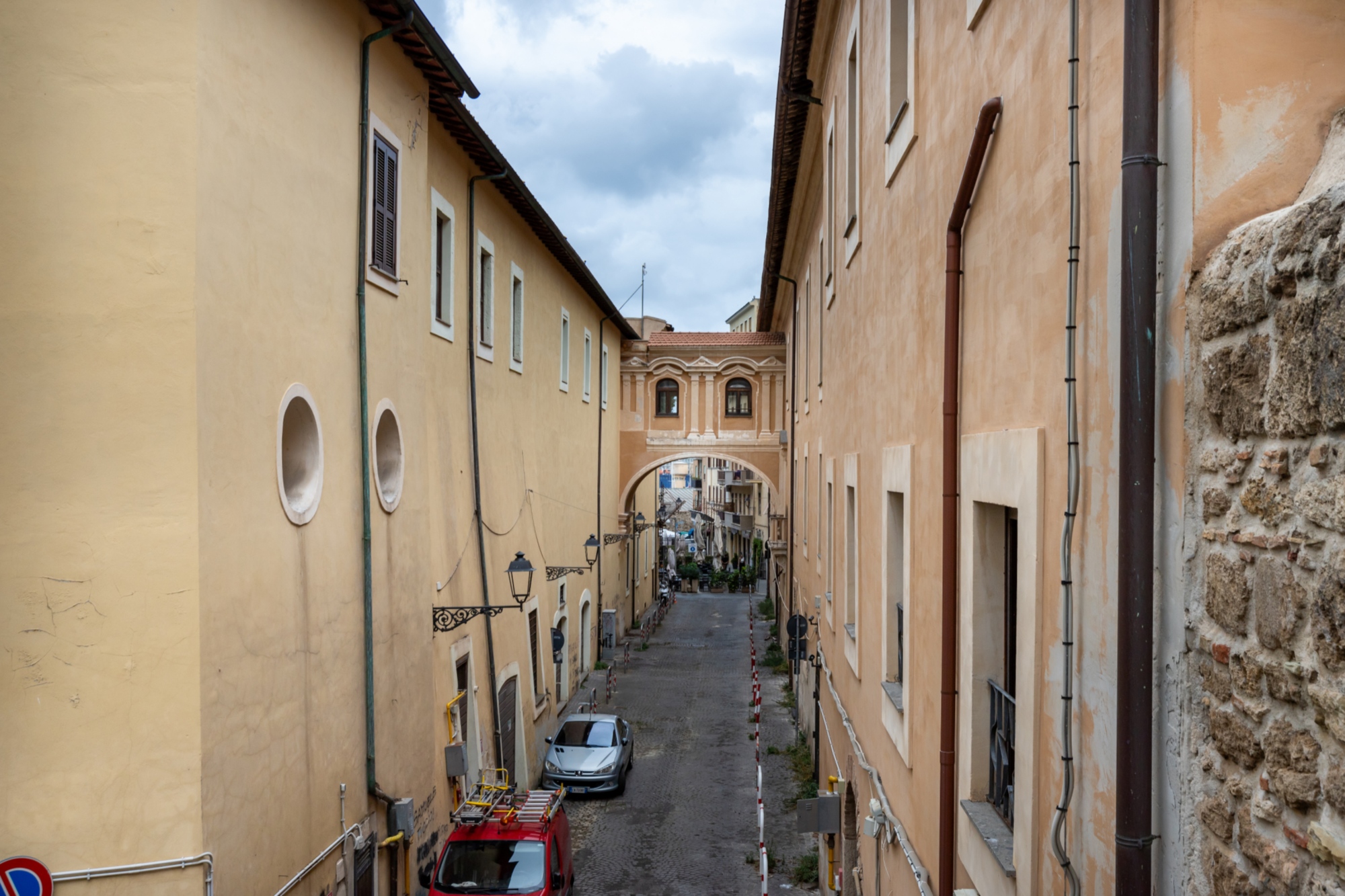 La biblioteca è stata allestita all’interno di un palazzo dal passato glorioso. Si tratta del Palazzo dell’Ospedale vecchio, che venne costruito nel XVII sec. intorno all’antica Chiesetta di S. Paolo. La struttura sanitaria sostituì una preesistente infermeria per gli equipaggi delle galere, istituita dai Cavalieri di Rodi tra il 1523 ed il 1530. L’Ospedale era diviso in due sezioni distinte: l’Ospedale Militare della SS. Concezione e l’Ospedale Civile di S. Paolo. Nel 1638 le due strutture vennero unite mediante un ponticello e la loro gestione passò dall’ Arciconfraternita del Gonfalone all’Ordine Ospedaliero di S. Giovanni di Dio (Fatebenefratelli). Sotto il pontificato di Innocenzo XI l’Ospedale fu ristrutturato ed ingrandito grazie all’intervento del Tesoriere Generale Giuseppe Renato Imperiali, come testimonia l’iscrizione risalente al 1688, collocata sull’angolo dell’Infermeria Presidiaria in Via delle Vecchie Mura. L’edificio è stato utilizzato come struttura sanitaria fino agli anni ’70, quando venne costruito il Nuovo Ospedale, che conserva il nome di S. Paolo. Dopo molti anni di abbandono il Palazzo è stato profondamente restaurato e riportato all’antico splendore. Oggi è sede dell’Archivio Storico e Notarile oltre che della biblioteca del Comune di Civitavecchia.