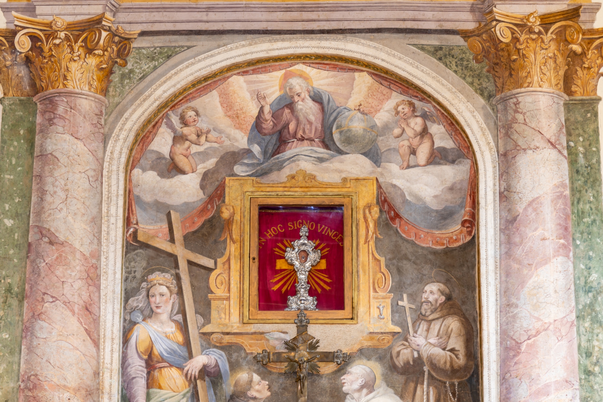 La struttura è molto semplice e lineare. L’interno è costituito da un’unica navata affiancata da due cappelle. Sull'altare centrale si trova un affresco con santi in venerazione al cui centro sorge una nicchia con il reliquiario della Santa Croce.