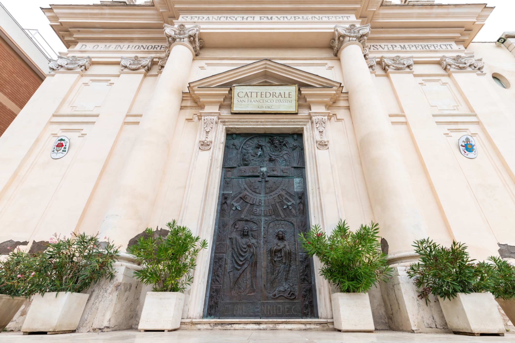 Una volta giunti dinnanzi alla Cattedrale potrete ammirarne l’elegante e solida struttura, l’alta facciata barocca a doppio ordine ionico con l’unica porta centrale da cui scende e si allarga a ventaglio un’ampia scalinata.